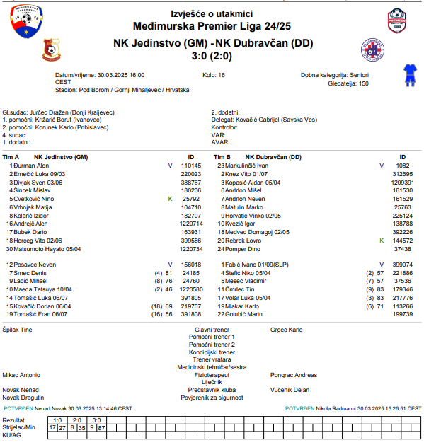 Jedinstvo je rutinski na svom stadionu došlo do pobjede i 3 boda. Bubek postiže pogodak za vodstvo domaćih u 27. minuti. Podebljanje vodstva dolazi u 35. minuti kada zabija Kolarić. Točku na i stavlja Ladić golom u 87. minuti. Jedinstvo je tako u trećoj utakmici proljetnog dijela prvenstva upisala treću pobjedu!