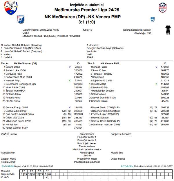 Na gostovanju kod NK Međimurca, lidera prvenstva, naša ekipa pružila je dobar otpor, ali domaćin je odigrao utakmicu na visokom nivou. Nisu puno griješili, iskoristili su svoje prilike i zasluženo slavili. Utakmica je bila energetski vrlo zahtjevna, s puno borbe na sredini terena. Protivnik je imao više prilika, no i mi smo stvorili nekoliko izglednih situacija koje, nažalost, nismo uspjeli realizirati. Unatoč porazu, igrači su pokazali borbenost i angažman, ali kvaliteta domaće ekipe došla je do izražaja. Čestitam NK Međimurcu na zasluženoj pobjedi i na tome što opravdano drže prvo mjesto u ligi. Nastavljamo raditi i okrenuti smo sljedećim izazovima– Leonard Sanjković, NK Venera PMP.
