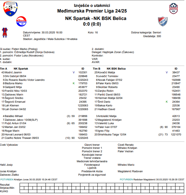 Podjela bodova momčadi sredine tablice na utakmici odigranoj u Maloj Subotici. BSK je ovim remijem došao do prvog boda ovog proljeća, dok Spartak nastavlja bez poraza drugi dio prvenstva. Spartak uz utakmicu manje ima 22 boda i nalazi se na šestoj poziciji, dok je BSK sedmi s 21 bodom.