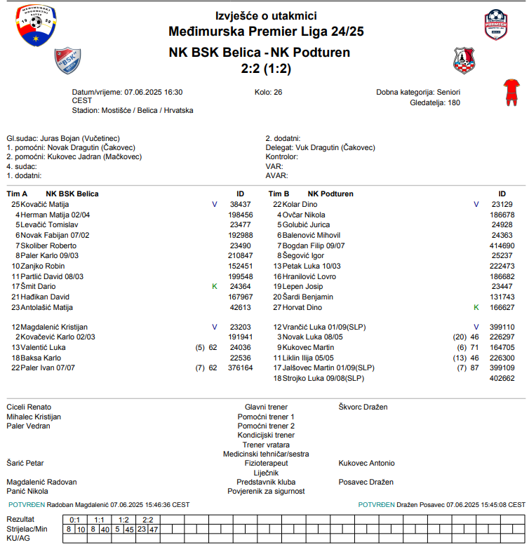 Novim golom Šegovića, njegov 23. ove sezone, Podturen je došao do prednosti u 10. minuti. Pred kraj prvog dijela BSK dolazi do izjednačenja, a strijelac je Paler. Na predah gosti ipak odlaze u prednosti. Pogodak na samom kraju prvog dijela za goste zabija Golubić. Konačnih 2:2 postavlja Antolašić u 47. minuti.