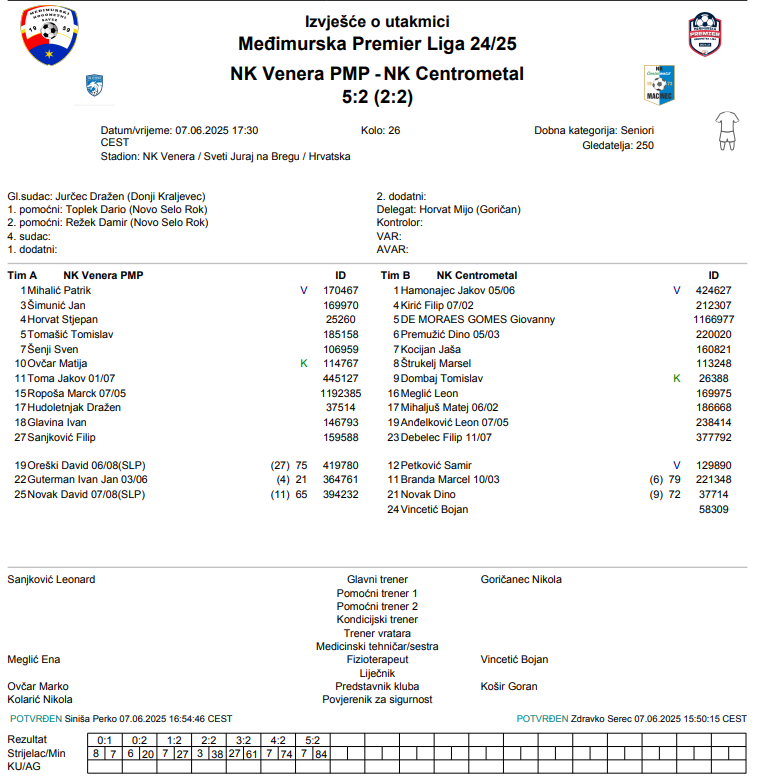 Pet utakmica 26. kola Međimurske Premier lige odigrano je u subotu. Podjela bodova na susretima u Belici, Draškovcu i Palovcu. Venera je s pet komada ispratila Centrometal, dok je Međimurec u gostima zabio čak 9 pogodaka u mrežu Kraljevčana.