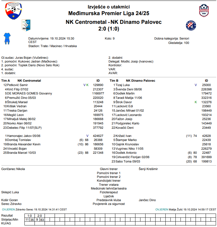Konačno tri boda kod kuće! Imali smo dosta poteškoća u pripremi utakmice, dosta ozlijeđenih igrača stvarao je veliki hendikep za nas. Imali su i gosti problema, dojma sam da smo mi ipak uložili više energije i želje za pobjedom, a to nam se na kraju isplatilo. Gosti mogu žaliti za neiskorištenim jedanaestercem za poravnanje rezultata 1:1, ali kada se sve analizira ipak smo mi zaslužno pobijedili. – istakao je trener Centrometala Nikola Goričanec.
