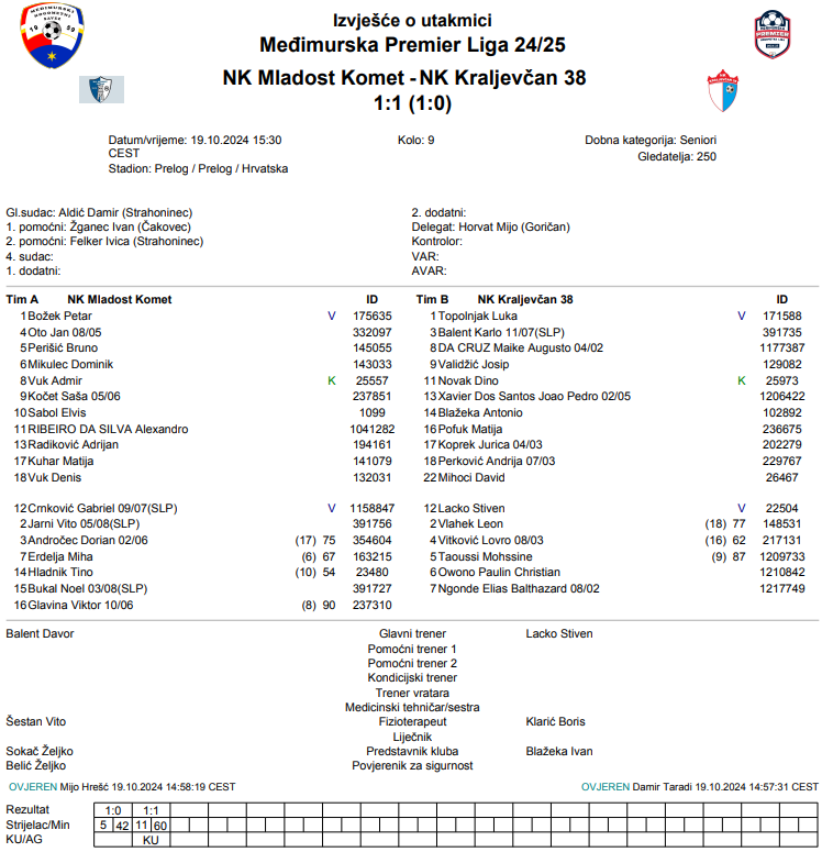Još jedan susret bez pobjednika viđen je danas u Prelogu. Tamo su Mladost Komet i Kraljevčan odigrali 1:1. Mladost je na kraju prvog poluvremena preko Brune Perišića krunisala vrlo dobru igru. U 60. minuti domaći vratar Božek kasnim startom oborio je gostujućeg igrača što je rezultiralo jedanaestercem u korist Kraljevčana. Kapetan Dino Novak je isti iskoristio i tako svojoj momčadi donio bod i ovo kolo.