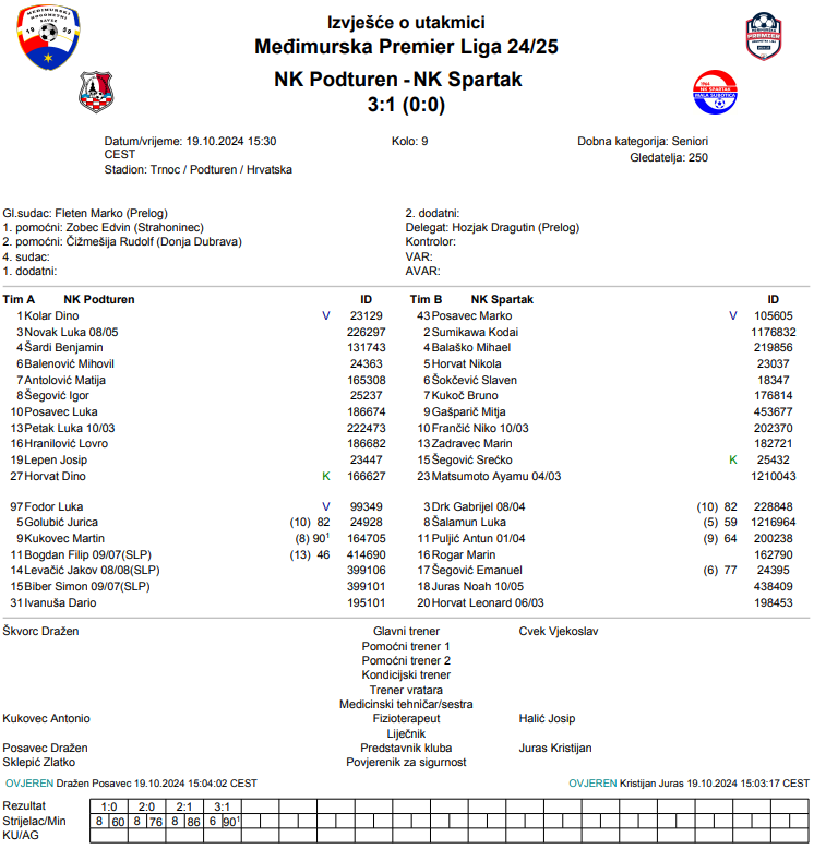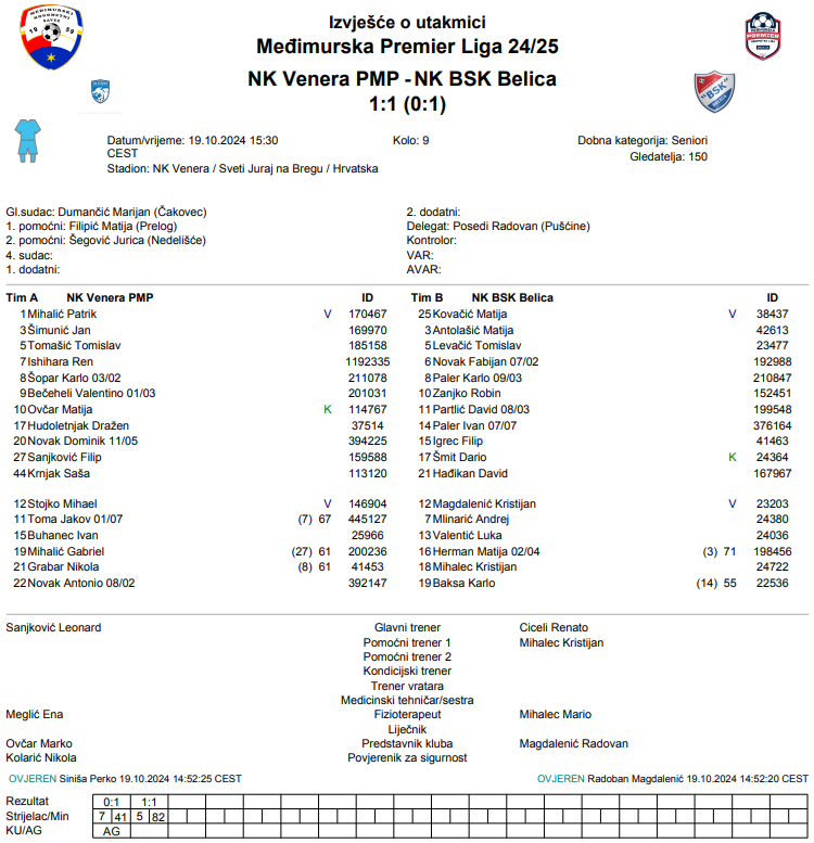 Odlična utakmica u Svetom Jurju na Bregu završena je podjelom bodova. Nogometni akteri na obje strane prikazali su dobro izdanje pa se mora priznati da je neriješeno skroz realan ishod. BSK je poveo pred kraj prvog dijela kada je Ren Ishihara loptom zatresao svoju mrežu. Takav rezultat ostao je aktualan do pred kraj utakmice jer je Tomislav Tomašić tek u 82. uspio kapitalizirati dobru igru Venere i spasiti bod iz ove utakmice.