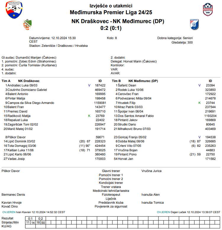 Zelenišće je prethodne sezone bila neosvojiva tvrđava, ali ove sezone Draškovec kod kuće na četiri utakmice ima četiri boda. Posebno je teško jer se suočavaju s povredama, a još teže je kada vam se na suprotnoj strani nalazi Međimurec. Izabranici Jurice Vručine pokazali su da im remi protiv Podturena u prethodnom kolu nije zasmetao i s teškog gostovanja donose sva tri boda. Za današnji trijumf najzaslužniji su Ivan Špoljar i Jakov Pinatrić koji su svojim pogocima omogućili novu pobjedu Međimurcu. Na pola smo puta jesenskog dijela, Vručina dosadašnjim izdanjem njegovih momaka može biti izuzetno zadovoljan.