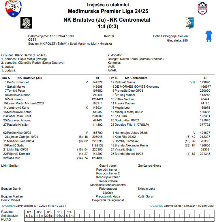 Danijel Kojter debitirao je na klupi Bratstva nakon što je tijekom tjedna zamijenio Liklina na mjestu glavnog trenera. Tamo ga je na suprotnoj strani dočekao Nikola Goričanec koji svoj Centrometal održava na drugom mjestu prvenstvene ljestvice. Nemilosrdni su bili nogometaši Centrometala prema novom treneru Bratstva jer su u pobjedi njihove momčadi zabili četiri pogotka. Dino Premužić, Darijan Treska i Alan Novko svojim pogocima su riješili susret već u prvom djelu. Prije predaha domaćini su ostali i s igračem manje pa su se do kraja morali priviknuti na to. Martin Michael Lesar smanjio je prednost gostiju u 55. minuti, ali je Marsel Štrukelj u 73. nakon kornera postavio konačnih 1:4.