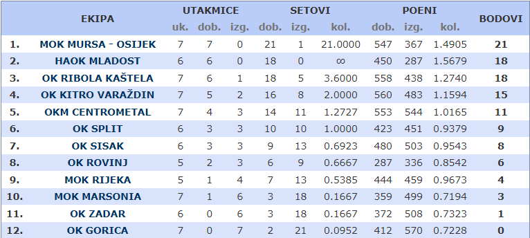 Na tablici vrh i dalje drži Mursa s 21 osvojenim bodom, ali i utakmicom manje od zagrebačke Mladost. Dno tablice je rezervirano za odbojkaše Gorice, koji su bez osvojenog boda ove sezone.