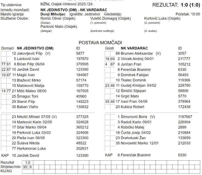 – Tvrda i muška utakmica ali korektna, rekao bi i prekorektna od strane moje ekipe koja je prvo poluvrijeme podbacila u agresiji i pristupu! Nažalost imali smo puno izostanaka i to se danas osjetilo pogotovo prvo poluvrijeme. Drugo poluvrijeme smo malo promijenili sustav i napravili zamjene što nam je donijelo terensku inicijativu u posjedu ali bez konkretnosti u završnici. Falilo je vjere, želje i konkretnosti da se postigne pogodak. Kao što sam govorio u najavi ove utakmice igrali smo otvoreno i na pobjedu ali danas nažalost nismo uspjeli! Jedinstvu čestitam na pobjedi. Mi se idemo pripremati za idućeg protivnika Slavoniju iz Soljana. Sudačka ekipa korektna. – rekao nam je Marko Dinjar, trener Vardarca.