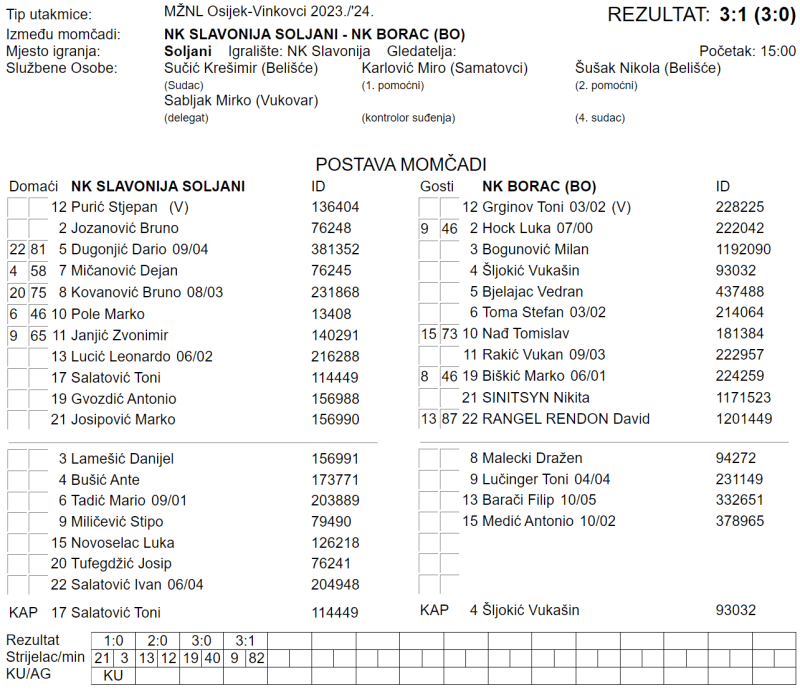 – Zaslužena pobjeda moje ekipe 3:1 (3:0) protiv vrlo dobre ekipe iz Bobote. Prvo poluvrijeme odlično gdje smo imali još 4-5 prilika ali smo ih promašili. U nastavku gosti rastrčani i vrlo dobri te su u 75. minuti postigli gol za konačnih 3:1 s kojim rezultatom smo ipak zadovoljni. Gostima želim puno sreće dalje u radu. Suđenje vrlo dobro. Golove za nas postigli su: Josipović (11 m), Gvozdić i Lucić. Nas već u srijedu čeka finale kupa protiv Cerne a poslije redovno kolo protiv lidera prvenstva u Vardarcu. Moram reći da smo danas igrali u Vrbanji jer se u Soljanima radi novi travnjak te se ujedno zahvaljujem u ime kluba N.K” Vrbanja” koja nam je izasla u susret i za treninge i utakmice. Sportski pozdrav iz Soljana. – zadovoljan je bio Milan Matijević, trener Slavonije.