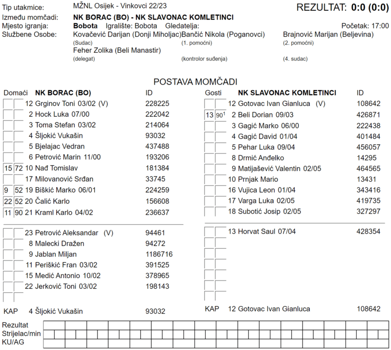 Borac iz Bobote i njihov gost iz Komletinaca su jučer podijelili bodove. Utakmica bez pogodaka završena je na način da svakako zadovoljniji mogu biti gosti, dok domaćin može žaliti za dva propuštena boda.