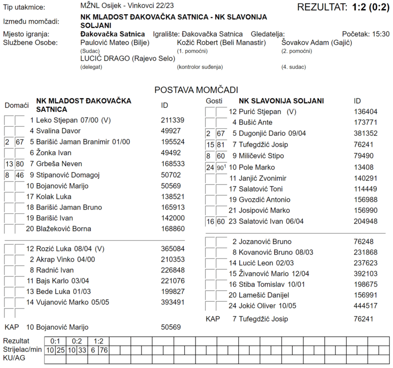 Četiri utakmice proljetnoga dijela prvenstva Međužupanijske nogometne lige Osijek – Vinkovci je iza nas, a Mladost je upisala sva četiri poraza. A još je veći problem što je ovo drugi domaći poraz (prvi protiv Jedinstva iz Donjeg Miholjca). Što se događa s nogometašima Mladost teško je u ovome trenutku reći, ali vjerojatno će malo detaljnija analiza dati odgovor na ovo pitanja. NE zaboravimo da je Mladost u proljeće krenula kao jedan od pritajenih favorita za naslov prvaka, a sada od 12 mogućih bodova, čista nula. A Satničani su dobro otvorili utakmicu. U prvih deset minuta imali su dvije stopostotne prilike koje nije realizirao Borna Blažeković: prvi puta je pucao s ruba kaznenoga prostora, ali pored gola, a drugi puta nakon što je Ivan Barišić pogodio prečku, Blažeković nije uspio s nekoliko metara ubaciti odbijanac. Dva puta je s lijeve strane u gostujući kazneni prostor ušao Neven Grbeša, ali bez rezultata. Nakon toga, kao da je netko promijenio domaći odnos prema igri. Satničani su jednostavno stali, igrali nepovezano, a gosti su polako pokazivali da znaju biti opasni iz kontranapada. Tako su gosti iz slobodnog udarca zatresli prečku i tako pokazali da se u Satnicu nisu došli braniti. U 25. minuti gosti su došli u vodstvo. Akcijom po lijevoj strani stigli su do kaznenoga prostora gdje je loptu dobio Marko Pole koji pogađa nebranjeni dio domaće obrane. Jednostavno cijela domaća obrana nije reagirala kako bi otklonila gostujuću prijetnju. Novi šok stigao je u 33. minuti kada je kardinalno pogriješio Luka Kolak koji je kao zadnji igrač obrane pokušao prevariti Marka Polea, ali mu je ovaj uzeo loptu i sam krenuo prema golmanu Leku. Gostujući napadač vidio je domaćega obrana koji je napustio svoja vrata i vanjskim dijelom kopačke pogodio je prazan gol. Od ovoga šoka Satničani se nisu oporavili do kraja prvoga dijela. U nastavku utakmice domaćini su krenuli sistemom „ajmo spasiti što se spasiti može“. Imali su terensku dominaciju, ali jednostavno realizacija je danas zakazala. Doduše, u 76. minutu Ivan Žonka smanjuje rezultat na 1:2 i tako ostavlja još 15 minuta domaćih momčadi da izbjegnu novi poraz. Međutim, gosti su borbenom igrom u obrani sačuvali minimalnu, ali zasluženu pobjedu.