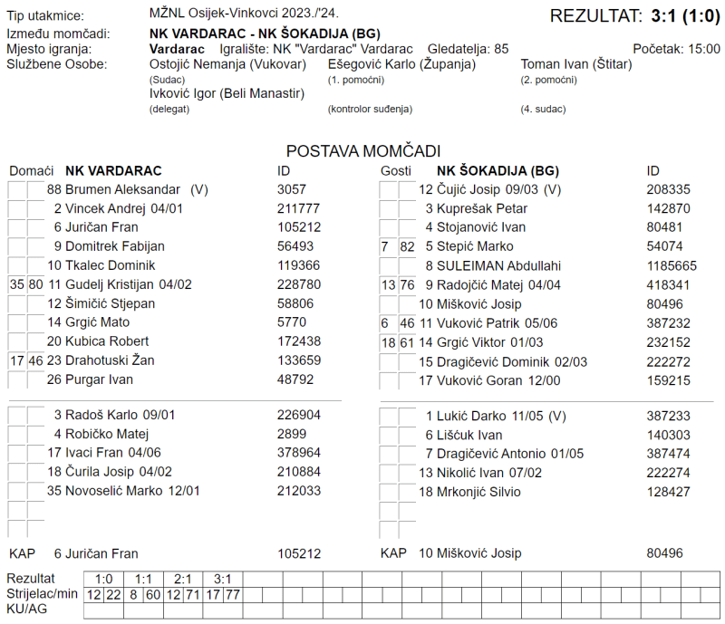 – Zaslužena pobjeda moje ekipe. Danas nam je nedostajalo par standardnih igrača ali dečki koji su dobili priliku su odradili lavovski! Čestitam momcima na mirnoći, vjeri, zalaganju i karakteru! Dečkima iz Šokadije želim puno sreće u nastavku prvenstva. Sudačka ekipa korektna! – zadovoljan je bio Marko Dinjar, trener Vardarca.