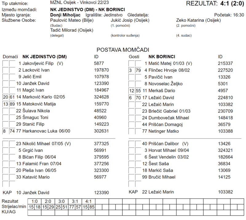 Jedinstvo je nakon tri uzastopna remija u subotu imalo imperativ domaće pobjede u utakmici u kojoj su dočekali Borince. Miholjčani su očekivano odmah otpočetka jurnuli po bodove što im se isplatilo već nakon pola sata igre kada su imali prednost od dva pogotka. Fantastičnu je utakmicu odigrao trostruki strijelac Matoković koji je Plave predvodio do nove pobjede.