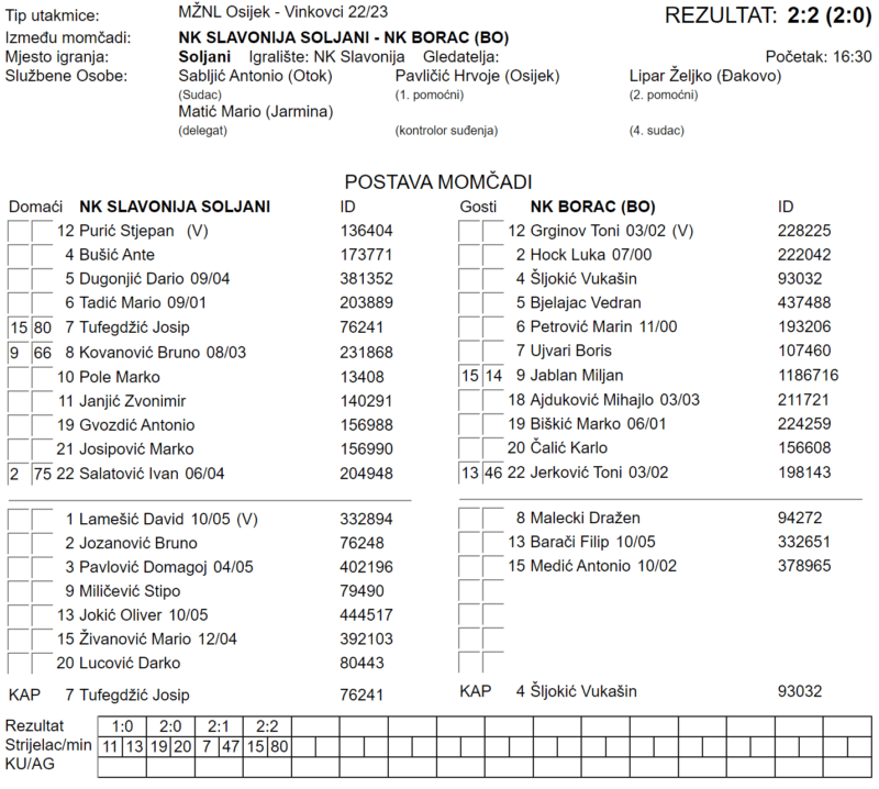 – Prvo poluvrijeme izuzetno dobro, vodili 2:0 i imali još nekoliko dobrih prilika a gosti ništa. U nastavku utakmice 35 minuta smo nestali s terena, a gosti su izjednačili na 2:2 da bi poslije toga opet proigrali i stvorili još 3 odlične prilike koje smo nažalost promašili. Zgoditke za nas su postigli Janjić i Gvozdić. Utakmica i suđenje korektno. Gostima sretno dalje a mi se okrećemo sljedećoj utakmici gdje nas čeka jako dobra ekipa. Sretan i blagoslovljen Uskrs svima koji ga slave. Sportski pozdrav iz Soljana. – mišljenje je Milana Matijevića, trenera Slavonije.