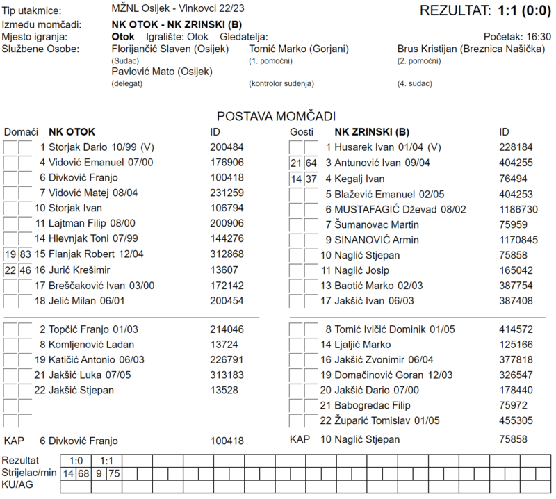 Mario Đurković je danas kao trener Zrinskog išao u goste svome dugogodišnjem klubu, u Otok. Ondje je njegova momčad stigla do boda. Prvo je poluvrijeme prošlo bez pogodaka, a onda je u 68. minuti Hlevnjak pogodio za vodstvo domaćina. Ipak, u 75. minuti susreta stvari na početak vraća Sinanović.
