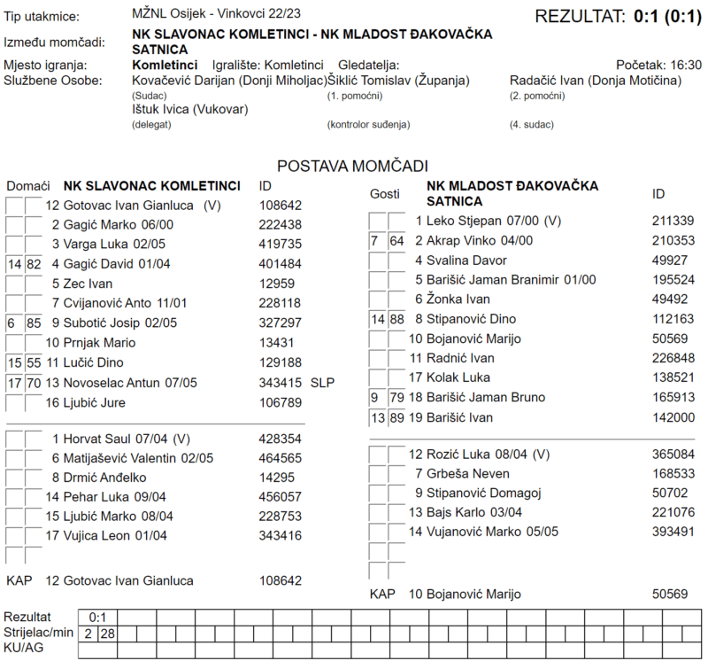 Mladost je slavljem u Komletincima došla do sedam bodova u zadnjih sedam dana. Domaći je Slavonac početnom agresijom pokušao stvari okrenuti na svoj mlin, međutim satnička je Mladost vrlo dobro odgovorila. Ključan se trenutak dogodio u 28. minuti kada su sjajnu suradnju pokazali dva susjeda, Branimir Barišić Jaman i Vinko Akrap koji je pogodio za vodstvo. Slavonac se do kraja ispuhao, Satničani su pak tražili drugi pogodak, no do kraja su pametnom igrom stigli do novih bodova.