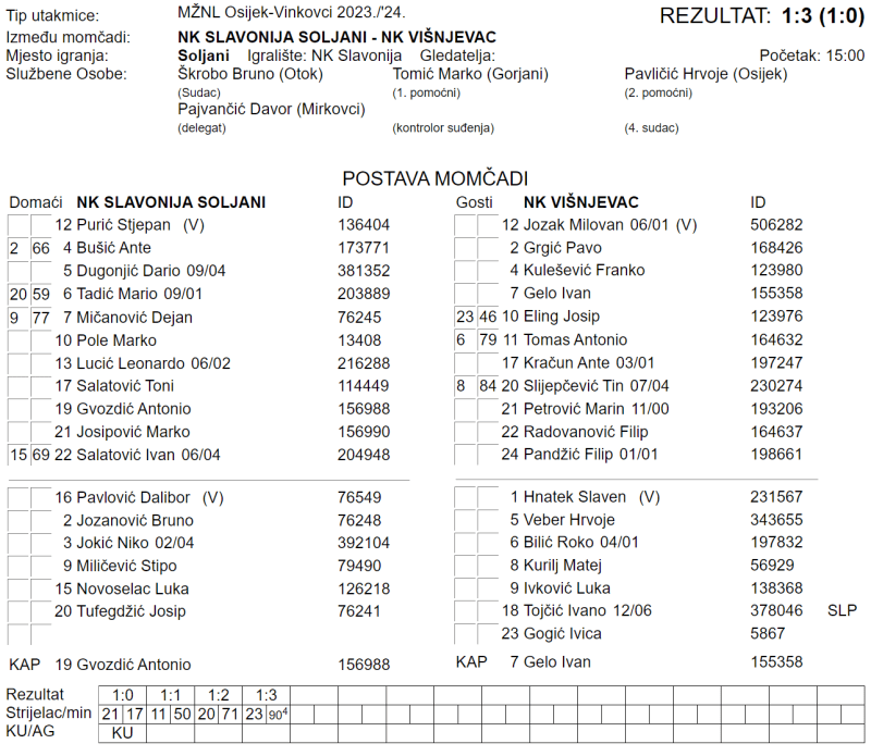 Nakon vrlo dobro odigranog prvog poluvremena, vodstva 1:0 te još tri tzv. zicera, viška igrača, kasnije viska dva igrača, zaslužena pobjeda Višnjevca koji je pokazao veliko srce i znanje te jako dobru fizičku pripremu. Gol za nas postigao je Josipović iz kaznenog udarca. Sto reći osim da smo drugo poluvrijeme prehodali. Sportski pozdrav iz Soljana. – izjavio je Milan Matijević, trener Slavonije.