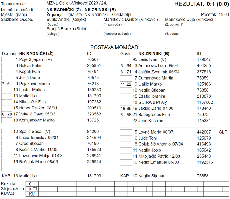 RADNIČKI (Ž) – ZRINSKI 0:1