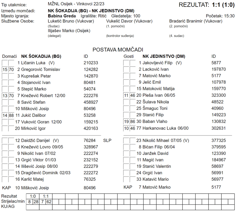 ŠOKADIJA – JEDINSTVO 1:1