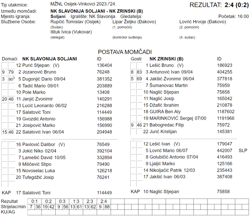 – Zaslužen poraz 2:4(0:2). Gosti poveli 0:3, mi se vratili sa dva lijepa gola Lucića, imali još dvije prilike za izjednačiti, ali na kraju dobili gol iz kontre kad smo maximalno preuzeli rizik. Čestitke Zrinskom na pobjedi i želim im puno uspjeha dalje u radu. Sportski pozdrav iz Soljana. – izjavio je Milan Matijević, trener Slavonije.