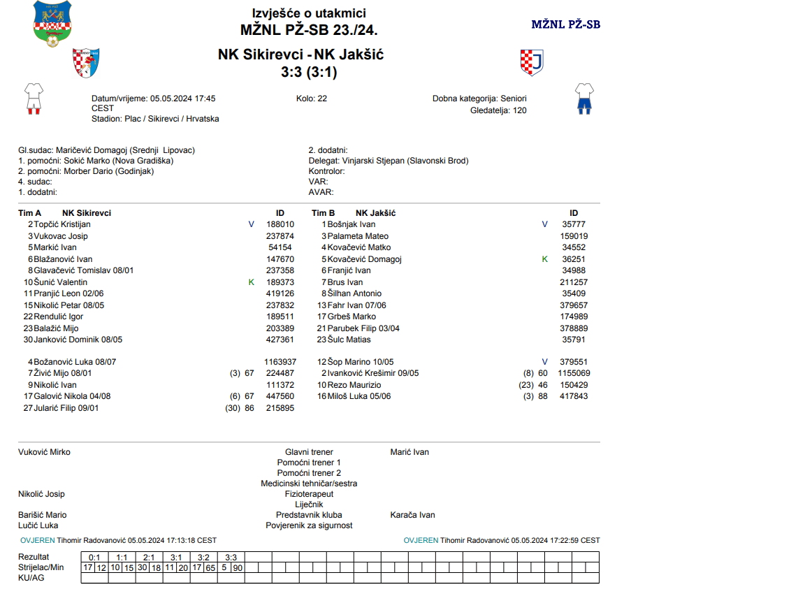 Zanimljiva utakmica sa puno golova se igrala u Sikirevcima. Gosti su poveli u 12. minuti preko odličnog Marka Grbeše. Domaćinima nije dugo trebalo da se stabiliziraju, samo 3 minute nakon primljenog gola izjednačavaju, strijelac je bio Valentin Šunić. U strijelce se upisao i Dominik Janković koji u 18. minuti dovodi Sikirevce u vodstvo. Sikirevci sa odličnom igrom dolaze do još jednog pogotka, Leon Pranjić povisuje vodstvo u 20. minuti. Nakon prvog poluvremena gosti su skupili glave i reagirali. Marko Grbeša je još jednom poentirao u 65. minuti i smanjuje vodstvo domaćina. Igrala se 90. minuta kada Domagoj Kovačević izjednačava rezultat i donosi Jakšiću vrijedan bod sa teškog gostovanja.