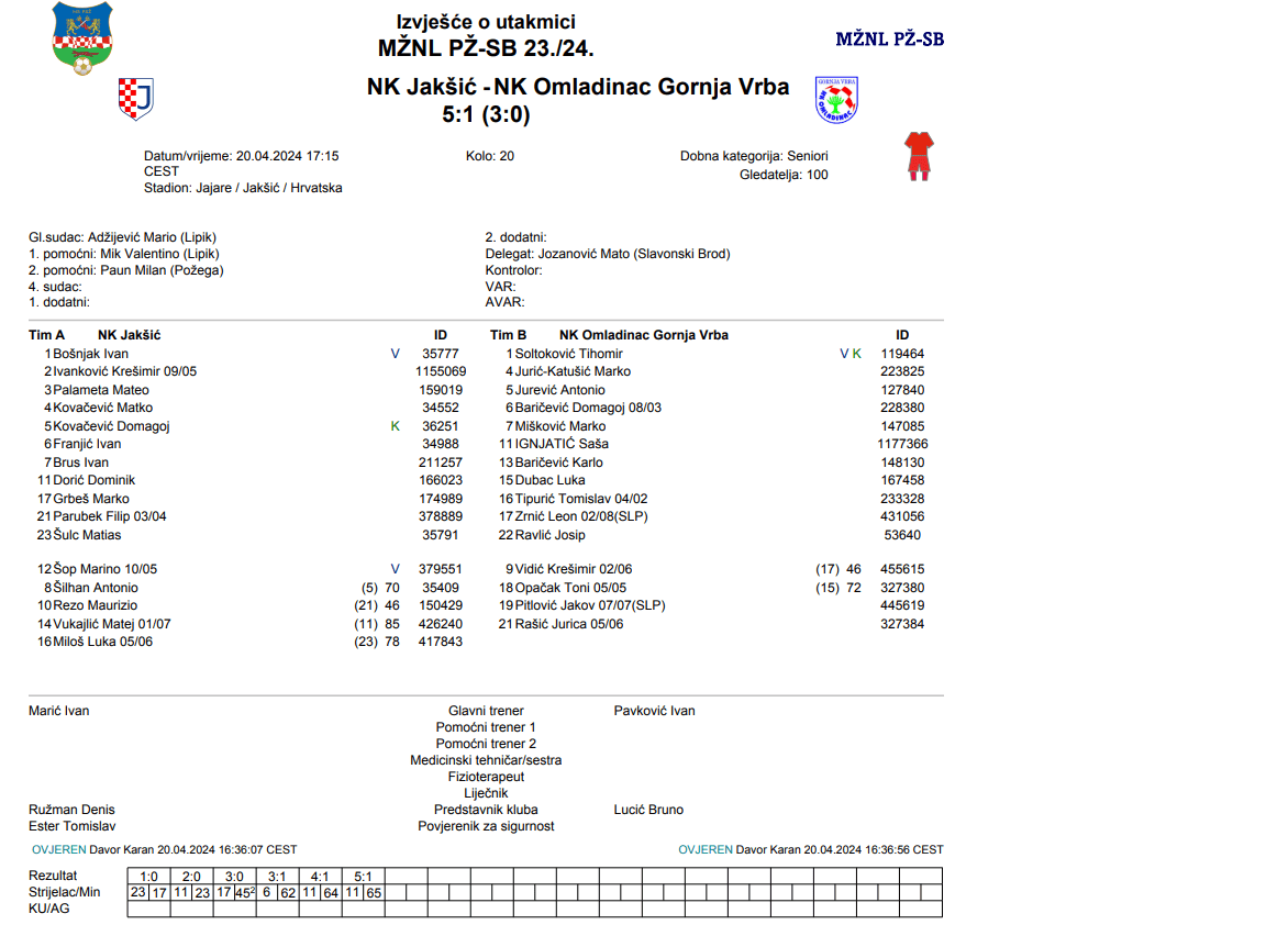 Matias Šulc je prvi postigao pogodak za Jakšić u 17.minuti,nakon njega odlični Dominik Dorić zabija za 2:0,a da bi u produžetku prvog poluvremena zabio Marko Grbeš za 3:0.Ekipa iz Gornje Vrbe je vratila malo svoje nade za preokretom u 62. minuti kada je Domagoj Baričević smanjio rezultat na 3:1.Onda se pojavio Dominik Dorić koji zabija dva brza pogotka u 64. i 65. minuti te utakmica završava rezultatom 5:1 i hattrickom Dominika Dorića.