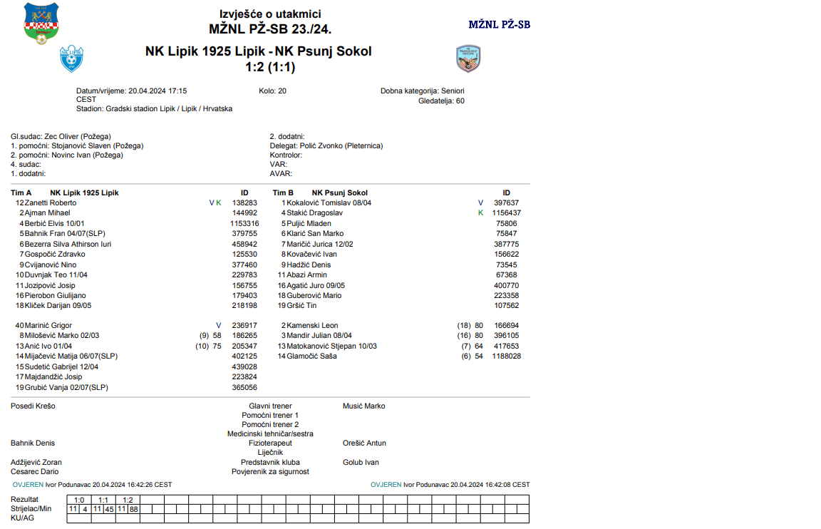 Ekipa Psunj Sokol je uzela važne bodove u pobjedi protiv Lipika i tako se odvojila od začelja.Lipik je odlično startao utakmici, već u 4. minuti su poveli preko Josipa Jozipovića.Odličan Armin Arbazi postiže gol za Sokol u 45. minuti i izjednačava rezultat.Igrala se 88. minuta kada se ponovno pojavio odlični Armin Arbazi i postiže gol te svojoj ekipi donosi sva tri boda.