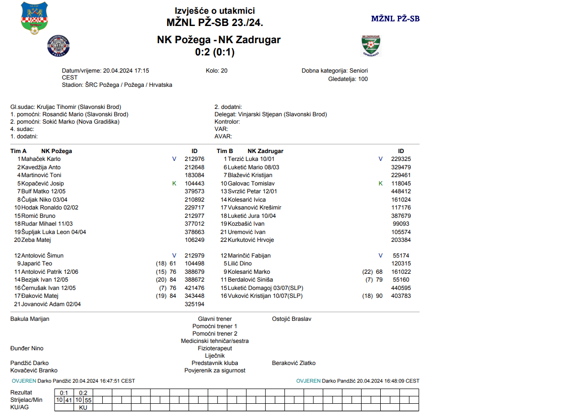Utakmica između Požege i Zadrugara nije razočarala ljubitelje nogometa,posebno se istaknuo igrač Zadrugara,Tomislav Galovac.U 41. minuti,Galovac je postigao gol koji je doveo Zadrugar u vodstvo od 1:0.Njegova izvanredna igra nije stala tu – u 55. minuti, ponovno je zabljesnuo postigavši drugi gol iz kaznenog udarca za svoju ekipu.Ekipa iz Požege će tražiti svoje bodove u idućem kolu protiv Hajduka, budući da će im svaki bod biti od pomoći u borbi za opstanak