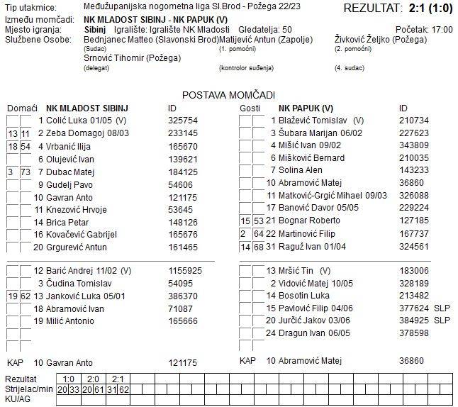 Antun Grgurević u 33. minuti doveo je Mladost u vodstvo te se s minimalnim vodstvom domaćina odlazi na predah. U 61. minuti susreta domaćini iz Sibinja odlaze na dva pogotka prednosti drugim pogotkom Antuna Grgurevića, da bi minutu kasnije Ivan Raguž prepolovio vodstvo domaćina. Do kraja susreta nije bilo pogodaka pa je susret završio slavljem domaće Mladosti 2:1.
