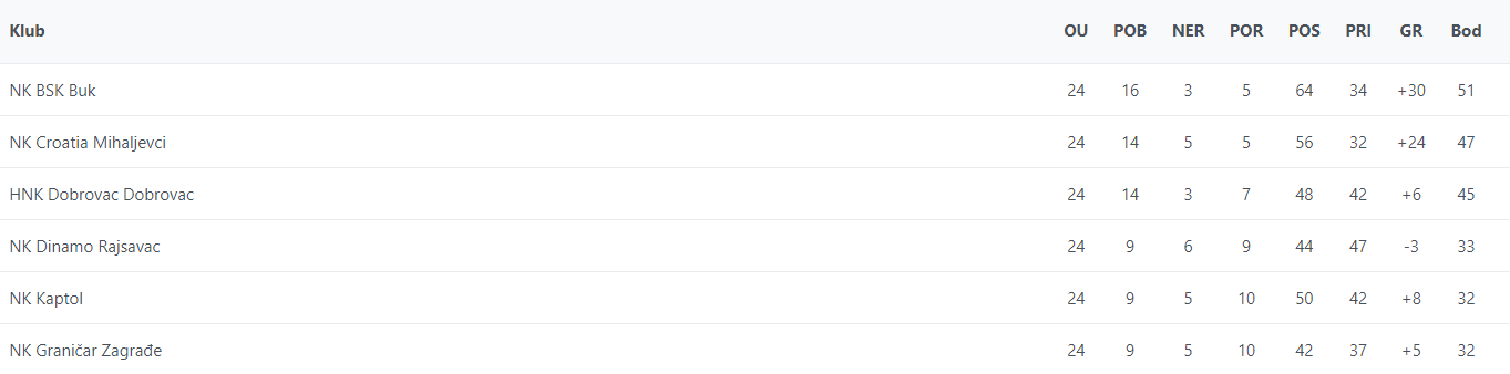 Croatia će ugostiti vodeću ekipu lige, BSK Buk. Croatia je trenutno na 2. mjestu na tablici sa 47 bodova, dok Buk ima 51 bod. Obje ekipe znaju koliko ova utakmica znači i sigurno će obje ići na pobjedu. Croatia pobjedom protiv Buka može zakomplicirati njihove planove u osvajanju lige.