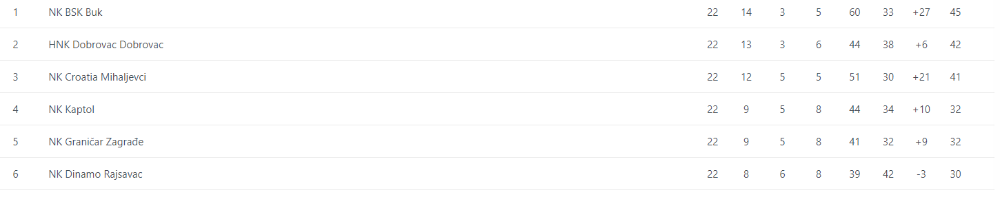 Croatia sa samo 4 boda manje od Buka je također u borbi za prvaka i ovu nedjelju će ugostiti četvrtu plasiranu ekipu, Kaptol. Za Kaptol ovaj vikend neće nastupat Jan Neruda zbog neodrađene suspenzije. Gosti su u posljednjih 5 utakmica osvojili samo 3 boda, dok je Croatia skupila 9. Domaćini također sa nadom da osvoje ligu, čekaju svoju priliku da vodeće ekipe kiksaju i da u nedjelju protiv Kaptola na domaćem terenu osvoje sva 3 boda.