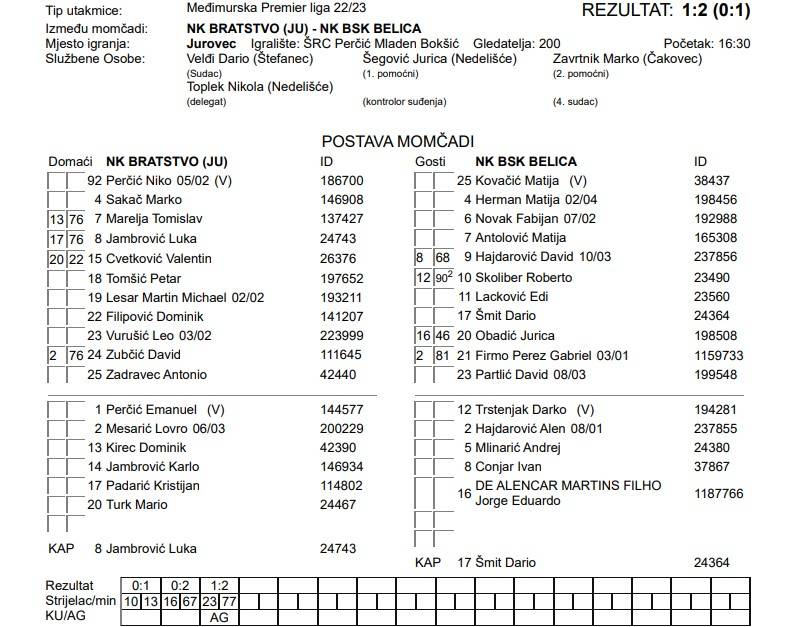 Bratstvo iz Jurovca na svojem terenu nije se moglo okoristiti lošom formom Beličana. BSK je na kraju sasvim zasluženo slavio i barem malo sprao negativan proljetni niz sa sebe. Roberto Skoliber zabio je za vodstvo BSK-a u 13. minuti. Jorge Eduardo u 67. povisio je na 0:2, a konačni rezultat postavio je još jedan beličanski igrač. David Patrlić postigao je autogol u 77. minuti, no to na kraju nije pomoglo Bratstvu da se domogne izjednačenja.