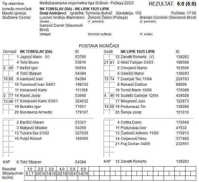 Tomislav iz Donjih Andrijevaca nakon dva neriješena ishoda kao četvrtoplasirana momčad ušla je u dvadeseto kolo gdje ih je čekao gost Lipik s dvadeset i devet osvojenih bodova, tri manje od svoga nedjeljnog domaćina.