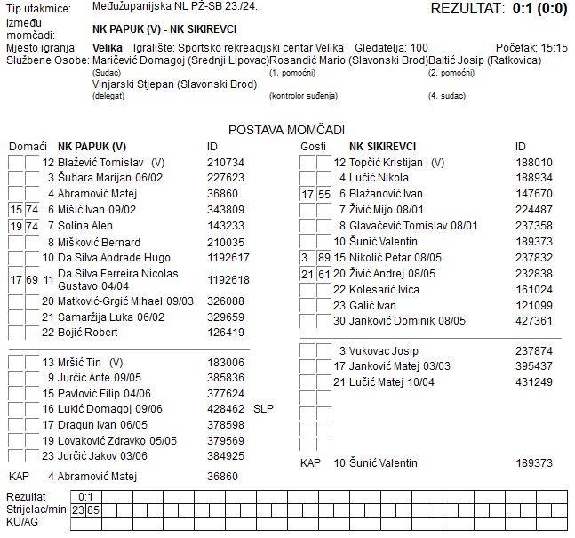 Papuk iz Velike nakon što je u devetom kolu obilježio treći prvenstveni poraz, sa 16 bodova na kontu u sklopu desetog kola dočekao je Sikirevce. Gosti su u prethodnih devet susreta ostvarili učinak od dvije pobjede, tri neriješena susreta i četiri poraza, što im je uoči ovog kola bilo dovoljno za jedanaesto mjesto poretka. U prvom poluvremenu susreta nije bilo pogodaka, a zgoditak odluke gledatelji su mogli vidjeti u 85. minuti kada je goste do vrijedna tri boda doveo Ivan Galić.