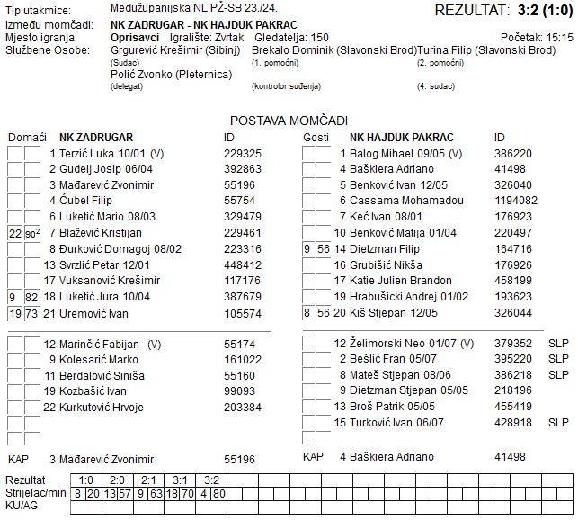 Zadrugar je stigao u prednost od 20. minute kada je za domaćina bio precizan Domagoj Đurković, što je bilo dovoljno da domaćin s minimalnom prednosti ode na predah. U dvanaestoj minuti nastavka Zadrugar udvostručuje svoju prednost pogotkom Petra Svrzlića, a zatim odgovaraju Pakračani preko Stjepana Dietzmana u 63. minuti. Prednost Zadrugara na plus dva vratio je Jura Luketić, a konačnih 3:2 djelo je Adriana Baškiere u 80. minuti susreta.