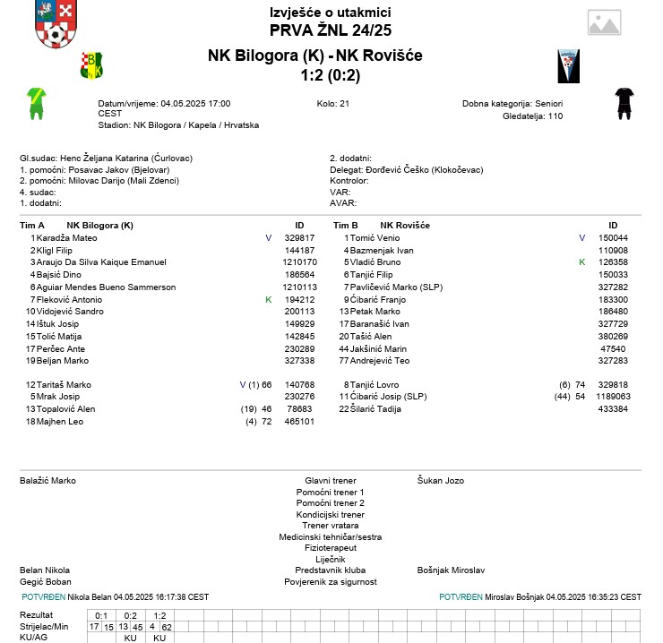 Nakon 20 odigranih kola, ekipa Bilogore je poražena. Sva tri boda iz Kapele odnijela je ekipa Rovišća, koja je tako jedina u ligi koja se može pohvaliti pobjedom protiv Bilogore. Zaslužni za to bili su Ivan Baranašić i Marko Petak iz penala, a zabijali su u 15. i 45. minuti. Jedini pogodak za domaćina djelo je Dine Bajsića iz još jednog penala, iz 62. minute. Gost je utakmicu završio s igračem manje jer je dva žuta skupio Alen Tašić. Bilogora je sada na -12 u odnosu na vodeći Daruvar.