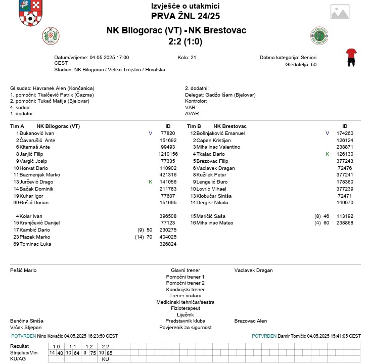 „Igrali smo doma s našim prijateljima iz Garešničkog Brestovca, krajnji rezultat 2:2, a mogu reći možda i najrealniji rezultat. Prvo poluvrijeme smo mi bili puno bolja ekipa gdje smo puno bolje stajali na terenu i vodili 1:0, a imali smo još tri, četiri mrtve šanse i zahvaljujući njihovom vrataru rezultat je ostao samo takav. Drugo poluvrijeme moram biti realan i reći da su oni preuzeli puno više toga, a mi smo bili dosta rezervirani, te gosti okreću na 1:2. Nakon toga imamo mrtvaca kojeg je njihov golman čudesnom reakcijom obranio. Nakon toga je bio dosuđen kazneni udarac koji je stvarno bio i bilo je 2:2. Poslije toga smo još imali jednu mrtvu šansu gdje smo možda mogli i pobijediti, ali opet ponavljam, najrealnije 2:2, s tim da moram napomenuti da smo danas nastupili bez pet standardnih igrača, ali isto tako i gosti su došli u okrnjenom sastavu, pa moram biti najrealniji i najpošteniji i reći da je to možda i najrealniji rezultat. Ništa, idemo dalje, iduće kolo gostujemo kod Hajduka u Hercegovcu gdje ćemo nadam se biti kompletni, idemo dati sve od sebe pa kako dragi Bog da. Pozdrav gostima iz Garešničkog Brestovca koji su stvarno bili fer i korektni, imali smo i zajedničku večeru gdje je sve prošlo u najljepšem redu i hvala im na poklonu koji su donijeli meni kao predsjedniku i treneru. Hvala im!“ – Mario Pešić, trener Bilogorca.