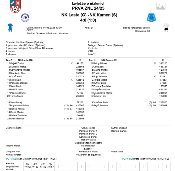 Ekipa Kamena nikako na zelenu granu, a na ovome su gostovanju ispraćeni sa četiri komada u svojoj mreži. Zabijali su Ivan Štrok u 12., Luka Barišić u 53., te Mario Tomić u 58. i 67. minuti. Gosti bez ispaljenog metka, a domaćin je to iskoristio i zasluženo uzeo sva tri boda. Lasta je 11., dok su gosti i nakon trećeg uzastopnog poraza ostali upravo treći, budući da i četvrto Bilo ne blista u svojim predstavama.