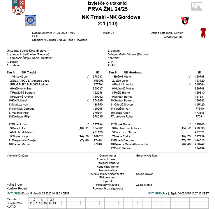 Jako važnu pobjedu ostvario je i Trnski, koji je dočekao ekipu Gordowe. Slavili su rezultatom 2:1, a poveli su u 16. preko Silve Souse. Sve do 80. minute držali su to vodstvo, no onda su kapitulirali budući da je Slaven Orlović izjednačio. Nisu domaćini dopustili da dugo bude remi, samo minutu kasnije Josip Stojak postavlja konačnih 2:1. Gordowa je ostala peta, a zanimljivo da su u ovome kolu izgubili svi od druge do pete pozicije na tablici pa je tako njihova međusobna razlika ostala ista.