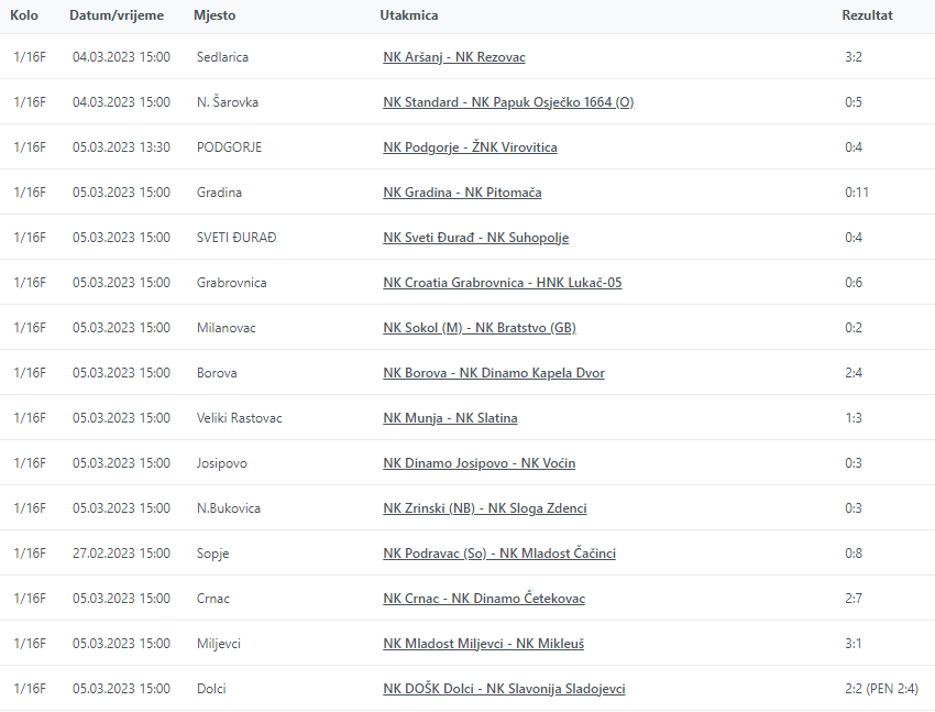 Odigrano je svih petnaest susreta šesnaestine finala kupa Virovitičko-podravske županije! Možda i najzvučniji rezultat kola ispadanje je županijskog ligaša Rezovca na vrućem gostovanju u Sedlarici, dok su ostali favoriti manje više prošli neokrznuti. Dramu jedanaesteraca imali su priliku vidjeti gledatelji u Dolcima koja je pripala gostima iz Sladojevaca.