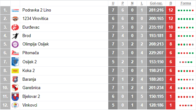 Na tablici Podravka se nalazi ispred Virovitice, no Virovitica ima utakmicu manje kojom mogu preokrenuti vrh tablice u svoju korist. Na dnu se nalaze Bjelovar i Vinkovci.