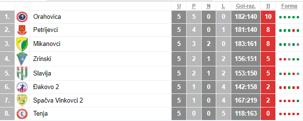 Na vrhu ljestvice se i dalje nalazi perfektna Orahovica sa 10 osvojenih bodova, a dno ljestvice je rezervirano za Tenju koja još nije došla do prvog prvenstvenog boda ove sezone.