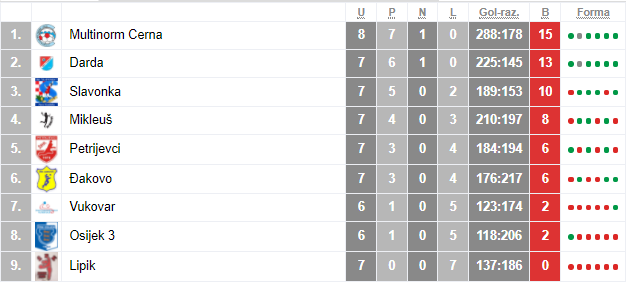 Tablica je predvođena rukometašicama Multinorm Cerne s 15 osvojenih bodova, dok je na dnu Lipik bez boda ove sezone.