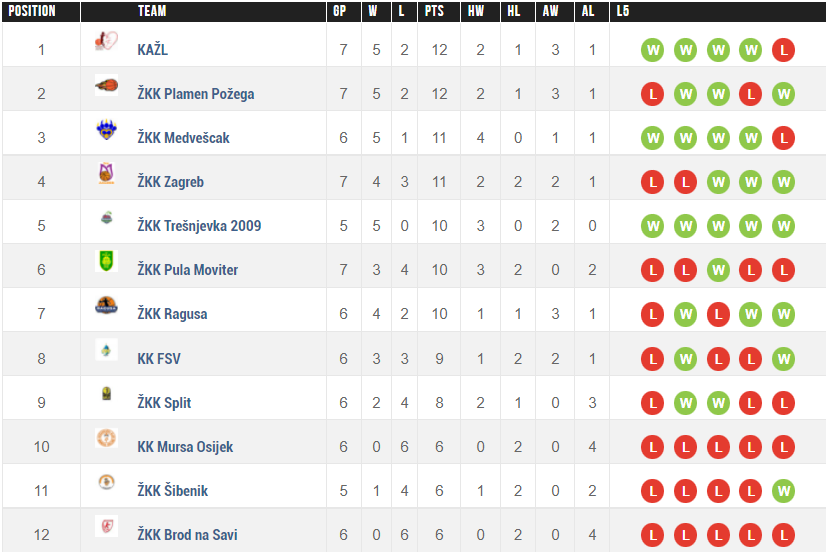 Na tablici i dalje je vodeća ekipa KAŽL sa omjerom 5-2, drugoplasirane su košarkašice Plamena sa istim omjerom. Na dnu tablice nalaze se Brod na Savi, Šibenik i Mursa VROS.