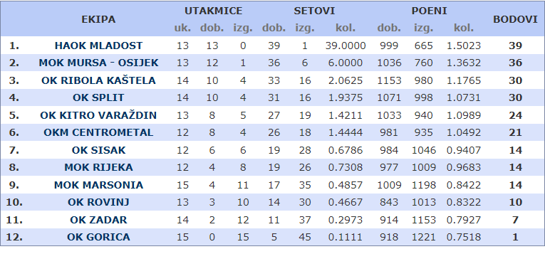 Odbojkaši osječke Murse su imali nešto lakši susret ovog vikenda, a vrlo dobrom predstavom su opravdali status favorita. Rovinj nije imao šanse, sigurnih 3:0 (25:19, 25:16, 25:9) nakon sat vremena odbojke je donijelo nova 3 boda za izabranike Marija Tepperta pa tako puni optimizma Osječani ulaze u bitku za finale Kupa u srijedu protiv OK Ribola Kaštela, no o tome nešto kasnije. Ova pobjeda je 12. po redu ove sezone za Mursu, samo 3 boda ih dijeli od zagrebačke Mladost i vrha prvenstvene ljestvice.