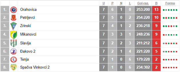 Nakon prvog dijela sezone najzadovoljniji mogu biti rukometaši Orahovicu jer su pobjedom osvojili naslov jesenskog prvaka ispred Petrijevaca, a poboljšanju rezultata nadaju se Spačva i Tenja na posljednjem mjestu.