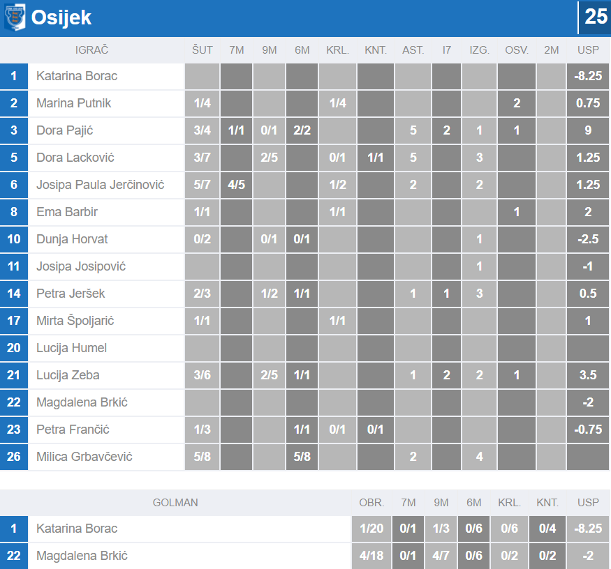 U porazu osječkih rukometašica najviše su se istaknule Josipa Paula Jerčinović i Milica Grbavčević s po pet pogodaka. Domaće su igračice na otvaranju utakmice imale nekoliko puta vodstvo, a do kraja prvog dijela se gošće nisu uspjele odvojiti na veću razliku pa je krajem poluvremena bilo samo minus dva da bi se na odmor otišlo s vodstvom Podravke od plus tri.