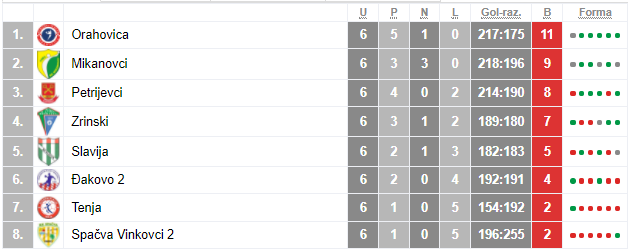 Bez obzira na remi, Orahovica je i dalje zadržala 1.mjesto ljestvice sa 11 bodova. Tenja se pobjedom pomaknula s posljednjeg mjesta, a koje je sada rezervirano za rukometaše Spačve sa samo 2 osvojena boda.