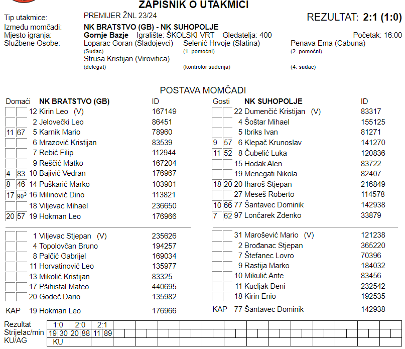 Bratstvo je upisalo vrlo bitnu pobjedu protiv odlične ekipe Suhopolja. Domaći su došli u vodstvo realizacijom kaznenog udarca, a do drugog pogotka su došli pred sam kraj utakmice. Da do kraja ne bude dosadno, gosti zabijaju pogodak, ali ne uspijavaju doći do boda.