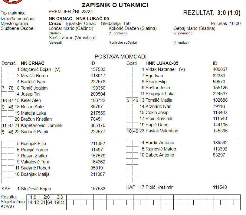 Crnac je na domaćem terenu upisao uvjerljivu pobjedu protiv Lukača. U ranoj fazi utakmice domaći su došli u vodstvo, da bi u drugom dijelu još jače stisnuli te su dodali još dva pogotka na svoj konto koji im je donio nova 3 boda.